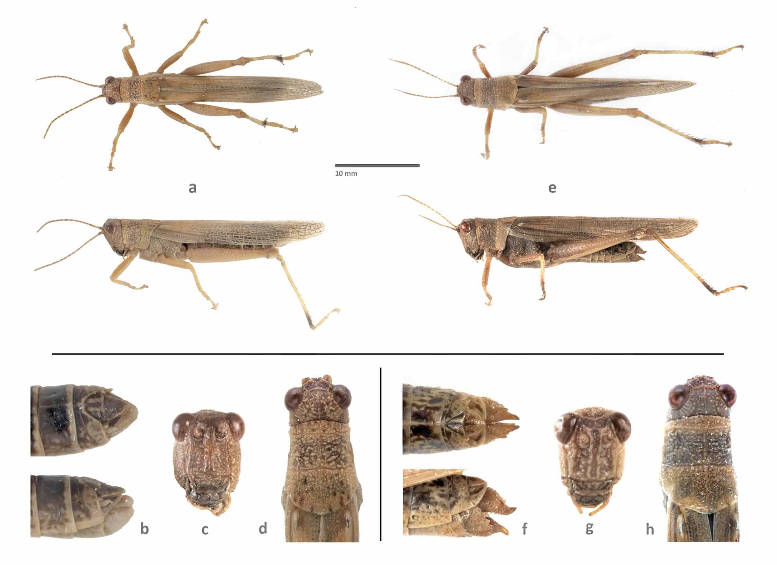 Male: a. Dorsal and lateral view. b. Terminalia, dorsal and lateral view. c. Head, frontal view. d. Head and pronotum, dorsal view. Female: e. Dorsal and lateral view. f. Terminalia, dorsal and lateral view. g. Head, frontal view. h. Head and pronotum, dorsal view. Scale= 10 mm.