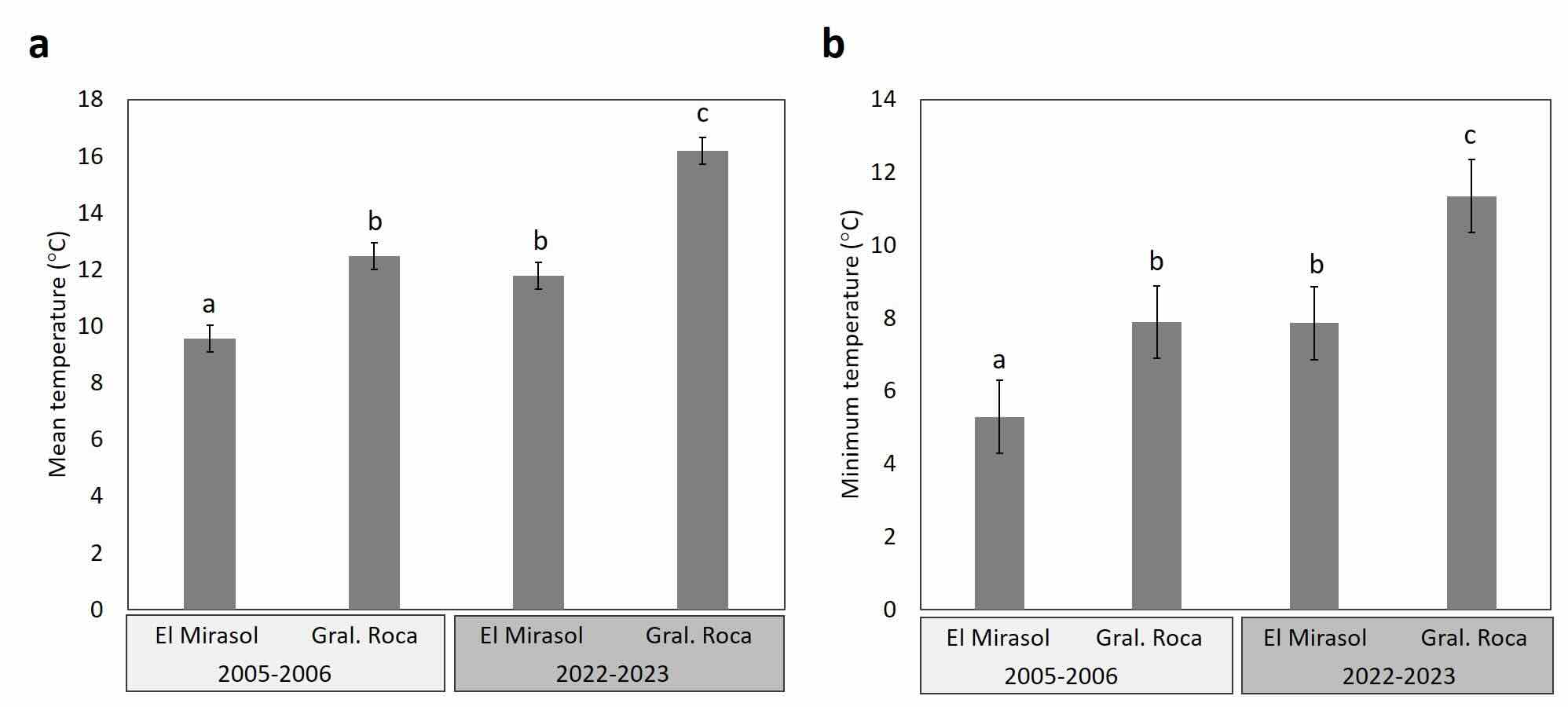 It is known that environmental temperature is extremely important for the development, reproduction, and dispersal in orthopterans (Willott & Hassall, 1998;Fielding, 2004), highlighting the deleterious effect that low temperatures have on the development in the egg stage (Fielding & Defoliart, 2010). To explore this idea, we compare the average and minimum temperatures of the first week of October 2022 and 2023 versus those of 2005 and 2006 (18 years ago) in El Mirasol (where we found C. patagona this year) and in General Roca (39° 01´ S, 67° 34´ W; Fig. 2) respectively. The choice of General Roca as point of comparison with the temperature at El Mirasol was based on three aspects: 1- C. patagona was first documented in the area over 60 years ago (Ronderos, 1973; Cigliano et al., 2024); 2- this locality was the southern limit of distribution of C. patagona for a long time (Ronderos, 1973); and 3- General Roca is at the same longitude as El Mirasol approximately (both are located between 67-68° W). Additionally, the temperatures from the first week of October were considered for comparison because, at that time of year, there is an increase in terrestrial arthropod activity and biodiversity in the region due to improved environmental conditions following the winter in the Southern Hemisphere (Mariottini et al., 2011;Olivera, 2018). Temperatures were taken from the database https://www.ready.noaa.gov/READYamet.php (Rolph. et al., 2017) and were analyzed using Generalized Linear Models (GLM) (Crawley, 2013) using the glmmTMB function in R (R Core Team, 2024). As a result, we found that both the average (GLM: Df= 3; X2= 103.43; p< 0.001; Fig. 3a) and the minimum (GLM: Df= 3; X2= 73.77; p< 0.001; Fig. 3b) temperatures in El Mirasol 18 years ago were significantly lower than those present at General Roca. Meanwhile, the current average (Fig. 3a) and minimum (Fig. 3b) temperatures in El Mirasol are similar to those in General Roca between 2005 and 2006. In this way, El Mirasol temperatures 18 years ago (colder than today), could have prevented the appearance of C. patagona previously.