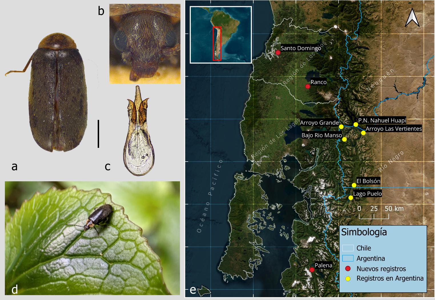Distribución. Argentina: Parque Nacional Nahuel Huapi, Provincia de Río Negro; Mallín La Heladera, Provincia de Río Negro; Lago Nahuel Huapi, Provincia de Neuquén; Puerto Blest, Provincia de Neuquén. Chile: Localidad de Santo Domingo, Provincia de Valdivia, Región de Los Ríos; Panguipulli, Región de Los Ríos; Cordillera pelada, provincia de Valdivia, Región de Los Ríos; Castro, Chiloé, Región de Los Lagos (Fig. 2e).