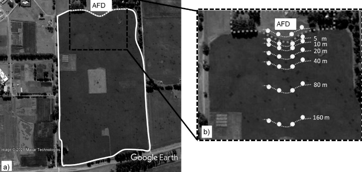 a. The white line delimits the wheat crop, the black dotted line delimits the sampled area, and the grey dotted line delimits the Associated Floral Diversity (AFD). b. Detail of the sampled area, the grey dotted line delimits the AFD and the white dots indicate the four permanent sampling points established for each distance. Therefore, each transect is composed of one dot of each distance. Balcarce Integrated Unit (Faculty of Agronomy- Mar del Plata National University and National Institute of Agricultural Technology). Extracted from Google Earth Pro.