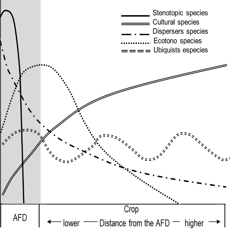 Associated floral diversity (AFD), defined as native or naturalized vegetation that grows spontaneously near the crop, may affect the spatial and temporal activity of both aphids and their predators. Within AFD, predator adults can feed, seek shelter, and enhance their fitness by supplementing their diet with pollen, nectar, and other floral secretions (Landis et al., 2000). Additionally, AFD can support a variety of aphid species (Zumoffen et al., 2015) and other arthropods, which may serve as alternative prey for predators (Landis et al., 2000). Consequently, areas with AFD act as reservoirs for both predators and aphids that may subsequently migrate to nearby crops. This process known as “Spillover”, is defined as the movement of individuals between habitats with different resources and it is an important ecological process influencing trophic dynamics between connected ecological communities (Tscharntke et al., 2005; Blitzer et al., 2012). The increased activity of biological control agents in AFD is linked to enhanced pest control services in crops (Landis et al., 2000; Albrecht et al., 2020). However, an exponential decline in these services with distance from the field edge has been reported, potentially leading to higher pest densities as the distance from the edge increases (Albrecht et al., 2020). This decline may be related to the dispersal capacity of biological control agents, as Duelli & Obrist (2003) identified five distribution patterns based on individual movement from AFD into the crop at increasing distances. “Stenotopic” species prefer AFD and are generally absent in crops. In contrast, “Cultural” species prefer crops, with higher abundances at greater distances from AFD. “Ecotone” species colonize crops from AFD and prefer the interphase between these habitats. “Disperser” species are more abundant in AFD, with declining as the distance from AFD increases. Finally, “Ubiquists” species lack habitat preference and are found in both environments (Duelli & Obrist 2003; Tscharntke et al., 2005) (Fig. 1). Although these distribution patterns provide a broad framework for understanding species dynamics, studies addressing the spatial and temporal interactions between aphids and their natural enemies in relation to AFD remain scarce. Given that aphid outbreaks can compromise yield and that natural enemies play an important role in their regulation, elucidating these patterns is crucial for improving biological control strategies. Understanding how AFD influences the spatial and temporal dynamics of aphids and coccinellids can provide valuable tools for designing better pest management strategies in wheat crops. Identifying the distribution patterns and behavior of these natural enemies will help to optimize their conservation and to enhance their effectiveness in biological control. This knowledge can be applied not only to local agricultural systems but also to other temperate agroecosystems, promoting more resilient and sustainable farming practices. In this context, the aim of this study was to assess the seasonal relative abundance of coccinellids and aphids in an AFD and a wheat crop at increasing distances from the AFD. We hypothesize that aphid populations progressively increase with greater distances from the AFD within wheat fields. Similarly, we hypothesize that coccinellid populations in wheat decrease as the distance from the AFD increases.