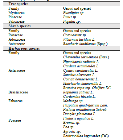 Study Site: The study was carried out from July to December 2019, in a wheat crop (37° 46' 09.85'' S, 58° 17' 56'' W, and 126 m a.s.l.) with associated floral diversity (AFD) along its northeastern edge (Fig. 2a), located at the Balcarce Integrated Unit (Faculty of Agronomy – Mar del Plata National University and National Institute of Agricultural Technology). Table I details the tree, shrub, and herbaceous species present in the AFD during the study, with Poaceae being the predominant family. On July 29, an intermediate-short cycle wheat cultivar was sown under no-tillage. No insecticides or herbicides were applied to the whole experimental area. Temperature and precipitation data were obtained from the permanent official weather station at the Balcarce Integrated Unit, situated near the experimental site.