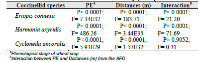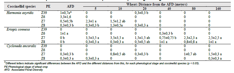 *Different letters indicate significant differences between the AFD and the different distances from this, for each phenological stage and coccinellid species (p < 0.05).