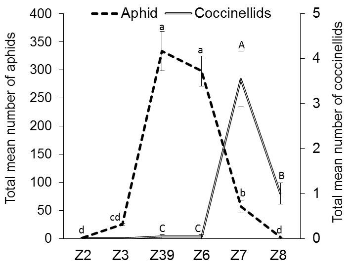 From Z2 to Z8, different lowercase letters indicate significant differences in Mean number of aphids (p< 0.05) and different capital letters indicate significant differences in total mean number of coccinellids (p< 0.05).