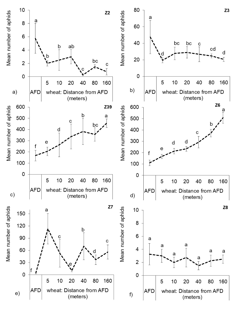 From Z2 to Z8, a total of 1,357 and 17,204 aphids were captured in the AFD and in the wheat crop, respectively. Aphid abundance in wheat varied with distance to the AFD (P< 0.0392; F= 2.31), the phenological stage of wheat (P< 0.0001; F= 245.54), and there was interaction between both (P< 0.0001; F= 42.28). Between Z2 and Z3, aphids arrived in wheat (Fig. 3), but their abundance was higher in the AFD (Fig. 4a-b). Then, it increased between Z39 and Z6, recording its maximum abundance in wheat (Fig. 3). At these stages, there was a significant increase in their abundance at increasing distances from the AFD, with the highest value observed at 160 meters. The mean numbers of aphids recorded in the AFD were lower than those reported in the wheat for each of the distances evaluated (Fig. 4c-d). In Z7, a reduction of 82 % in aphid abundance was registered, coinciding with the highest abundance of total coccinellids (Fig. 3) and no clear spatial pattern was observed (Fig. 4e). Finally, at the Z8 stage, aphid abundance continued decreasing, reaching similar values to those recorded in Z2 (Fig. 3). No differences were observed between the AFD and the wheat crop for each of the distances evaluated (Fig. 4f).