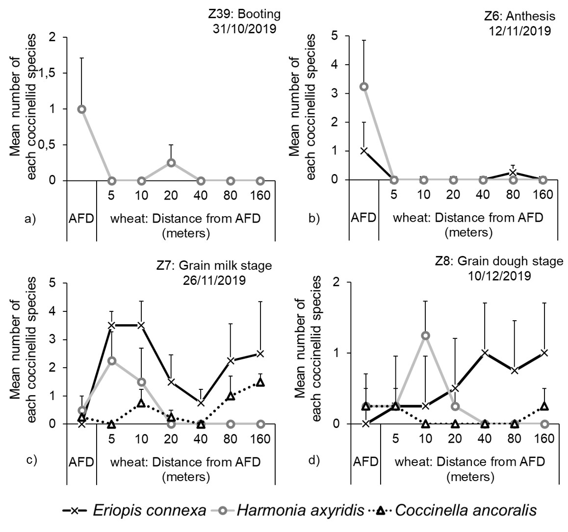 In Z39, H. axyridis was primarily located in the AFD, while its abundance was lower in wheat, where individuals were recorded only at 20 meters from the AFD (Fig. 5a, Table, III). In Z6, its abundance increased in the AFD, although it was not recorded within the crop (Fig. 5b, Table, III). Between Z7 and Z8, its abundance increased in wheat, but only between 5 and 40 meters from the AFD, with no individuals observed at distances further away (Fig. 5c-d, Table, III). As H. axyridis, in Z39, E. connexa was primarily located in the AFD and recorded its maximum abundance. In wheat, its abundance was lower, with individuals recorded only at 80 meters from the AFD (Fig. 5b, Table, III). Subsequently, it was only found in the crop. In Z7, its density was the highest, with no spatial pattern detected. However, in Z8 the density was lower, increasing with distance from the AFD but without significant differences (Fig. 5c-d, Table, III). Cycloneda ancoralis was recorded from Z7. In contrast to the other coccinellid species, it was primarily located in the crop increasing its abundance farther away from the AFD, but not statistically significant (Fig. 5c, Table, III). In Z8, it was only recorded in the AFD, in the areas of the crop close to the AFD (5 meters), and in the areas farther away in the crop (160 m) (Fig. 5d, Table, III).