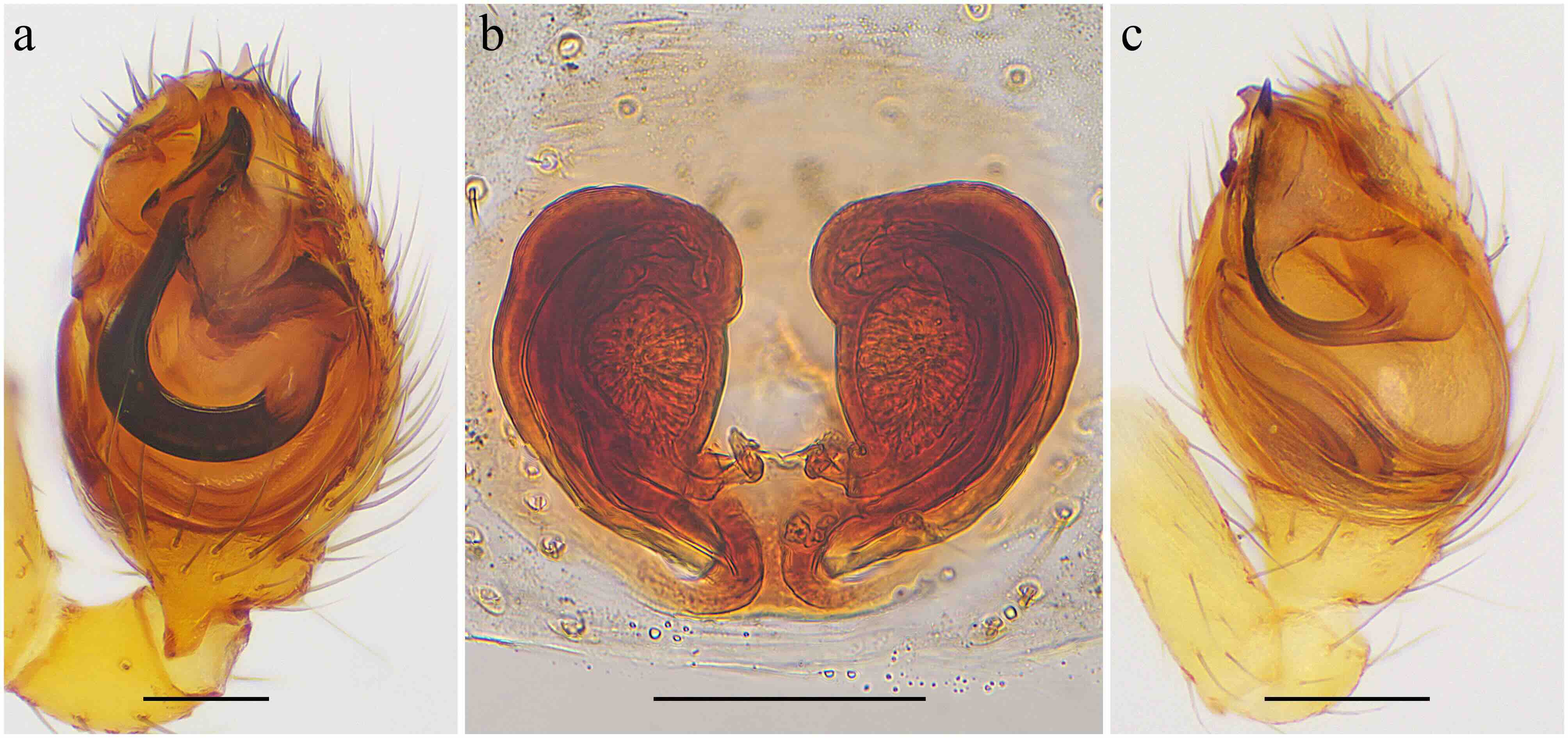 a. Stemmops cambridgei male palp, ventral view. b. Stemmops cambridgei vulva, dorsal view. c. Stemmops ornatus male palp, ventral view. Scale bars= 0.1 mm.