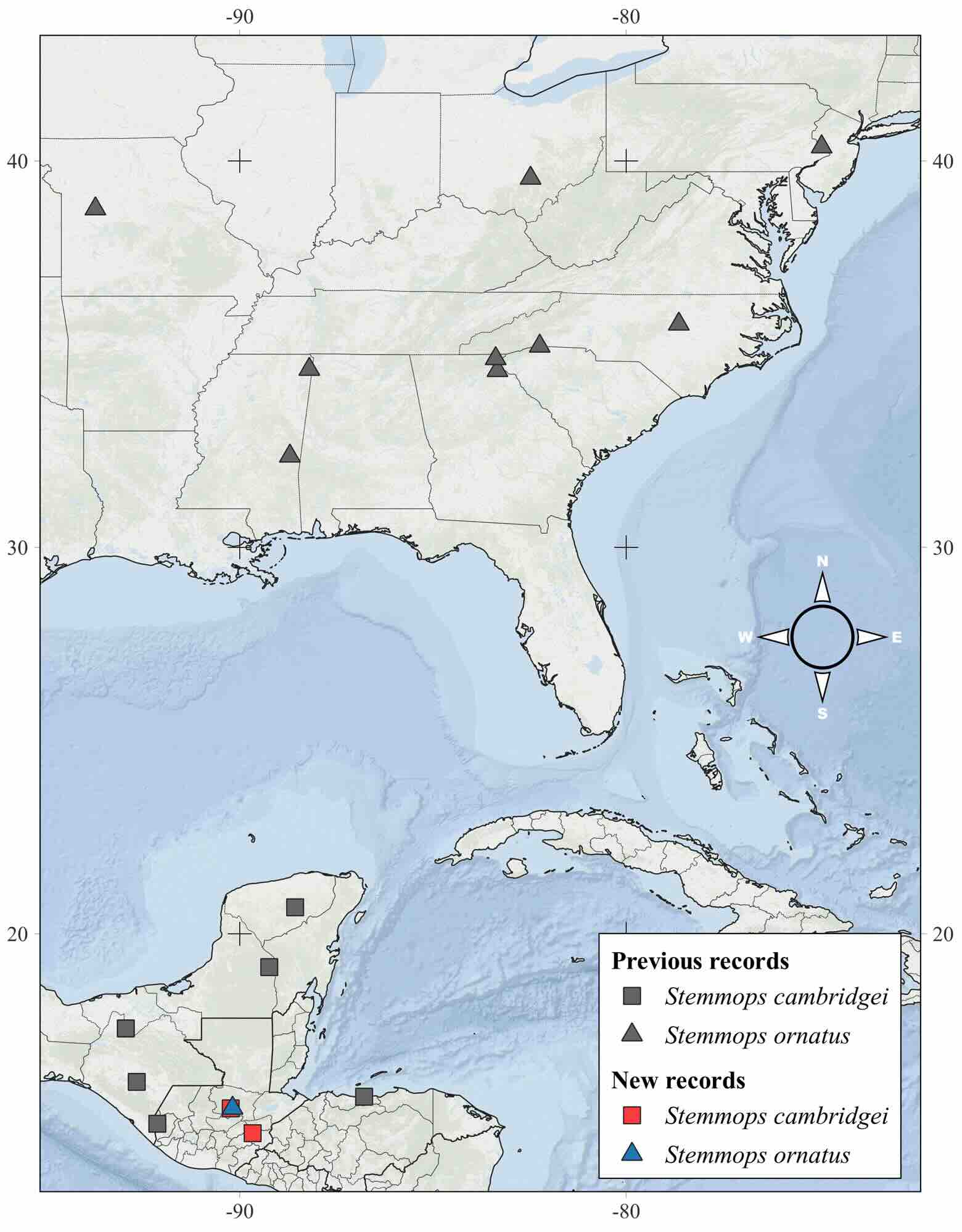 Theridiidae Sundevall, 1833, commonly known as cobweb spiders and comb-footed spiders, is a highly diverse spider family comprising 131 genera and 2,583 species worldwide (World Spider Catalog, 2025). The theridiid genus Stemmops Pickard-Cambridge, 1894, comprises 29 species, most of which are found in the Americas (World Spider Catalog, 2025). According to the latest spider species list for Guatemala (Herrera-Jordan, 2023), only two Stemmops species have been recorded: S. bicolor O. Pickard-Cambridge, 1894 and S. questus Levi, 1955. Here, we provide new distributional data for two additional Stemmops species, both collected while sifting leaf litter in a tropical forest in Guatemala.