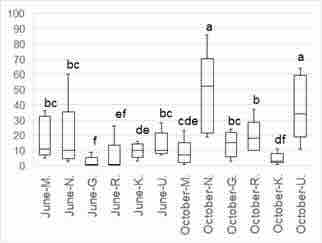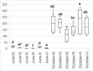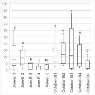 The box plot in Figure 1 illustrates the date-block interaction for F. platensis. A clear gradient of infestation is depicted, extending from the Tulbaghia-infested plant with F. platensis to the garlic crop in the field. The two closest blocks showed significantly higher levels of infestation compared to the other three blocks during the June sampling. However, in the October sampling, the first four blocks exhibited no significant differences amongst themselves when compared to the initial two blocks from the earlier date, but their overall levels were significantly lower. Conversely, no significant interaction between date and block was found for T. tabaci.