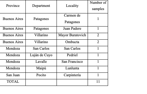 Samples of garlic leaves were collected from various commercial crops in three provinces of Argentina during the season 2022 (Table I). The entire aerial part of three randomly selected plants was harvested from each crop and placed in polyethylene bags. In the laboratory, thrips were extracted by washing the plant material in a plastic container filled with water and a few drops of low-foam detergent. The thrips were then separated using a 100-micron sieve and transferred to vials containing 70 % ethanol for counting and identification. Identification was performed under a stereomicroscope by comparison with previously identified material and keys (Cavalleri & Mound, 2012; de Borbón, 2009; de Borbón & Zamar, 2018), as well as with Holotype and Paratypes.