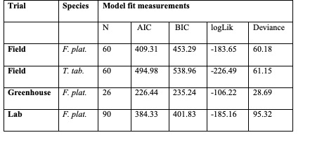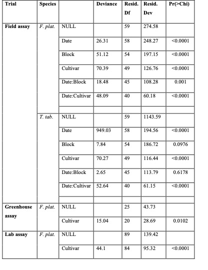 Table II summarizes the goodness-of-fit measures for statistical models, categorized by trial type and thrips species. All results from the Generalized Linear Models (GLMs) were significant, with the exception of the date-block interaction for T. tabaci (Table III).