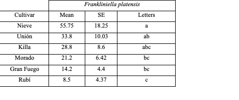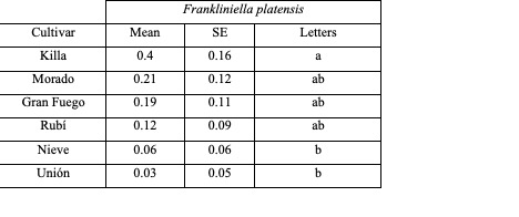 Frankliniella platensis was reared successfully on all cultivars tested. Various stages of the insect were found on these plants, including larvae, prepupae, pupae and adults. The GLM parameters and results are shown in Table II and III. Comparisons between cultivars by LSD analysis are presented in Table IV. The cultivar Nieve was the most preferred, not differing significantly from the cultivars Unión and Killa, but differing from the other three cultivars. Gran Fuego, Morado and Killa did not differ from each other, and Rubí was the least preferred, only differing from Nieve and Unión