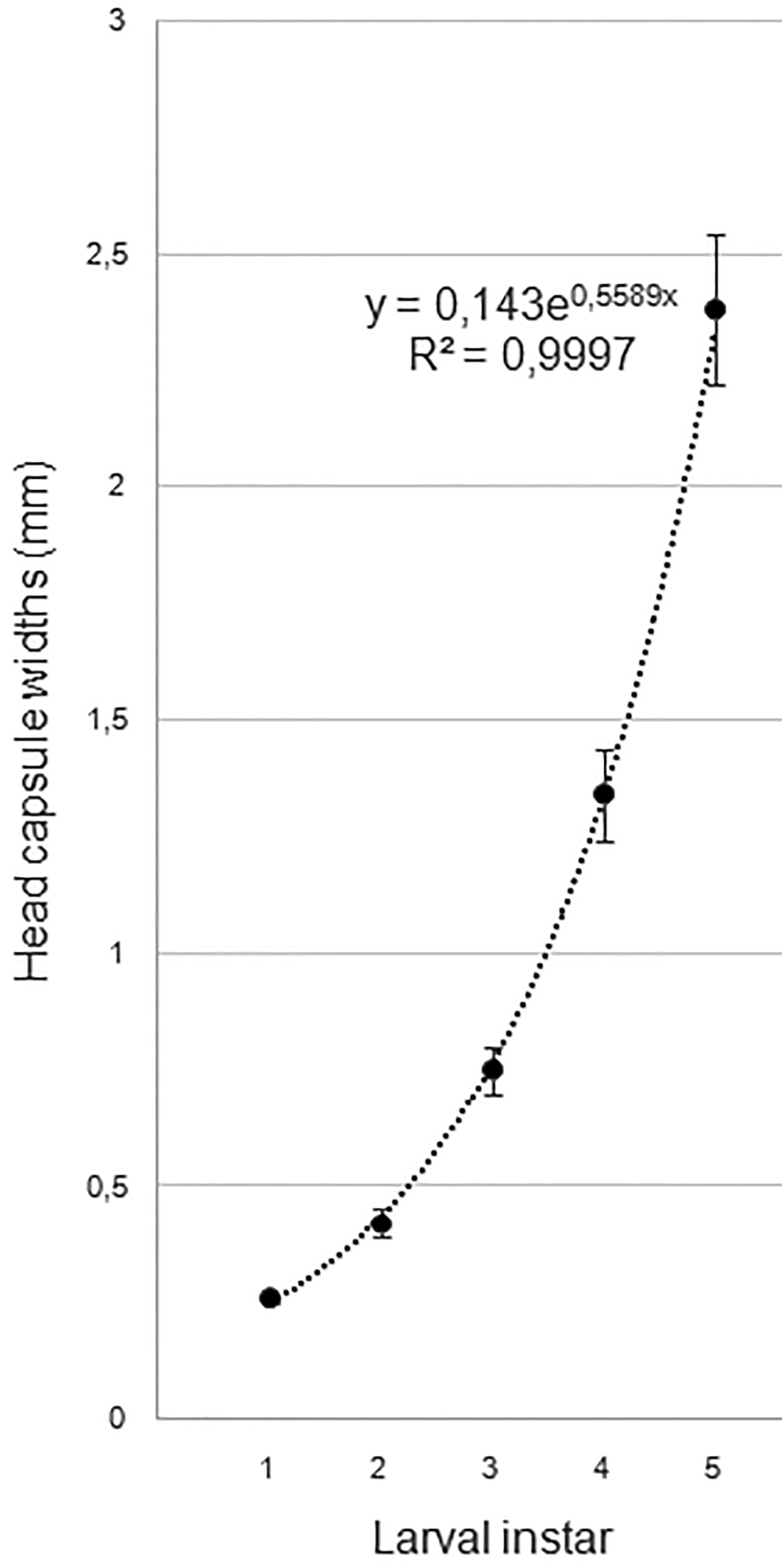 Baculoviral pathogenesis in lepidopteran larvae is heavily age-dependent. Therefore, strict precision is required regarding larval instar at inoculation. As no biometric data were available for H. gelotopoeon, these parameters were established prior to the bioassays. Healthy insects used for these and subsequent studies were reared at 25±1 °C and 16:8 (light:dark) photoperiod, and fed with artificial diet (slightly modified from Greene et al., 1976). A cohort of 30 individuals was supervised daily between 07:30 a.m. and 12:00 a.m. from hatching to pupation. Moultings were evidenced by the detachment of the head capsules, which were recovered and measured under an Olympus SZX9 stereomicroscope (Olympus Optical Co. LTD, Tokyo, Japan) using Image-Pro Plus (Media Cybernetics Inc., Bethesda, Maryland, USA). Five larval instars were recorded. Head capsule widths (HCW) exhibited a regular geometric progression across successive larval instars, in accordance with Dyar’s rule (Dyar, 1890), albeit with a relatively high average growth ratio of 1.74 between instars. Mean HCW values were 0.26±0.01, 0.42±0.03, 0.75±0.05, 1.34±0.10, and 2.38±0.16 mm for first to fifth instars, respectively. At least under the artificial rearing conditions described, low standard deviations and the absence of overlap among developmental groups supported HCW as a reliable indicator for discriminating instars. The near-perfect fit to the adjusted equation corroborated the consistency of the data. (Fig. 1).