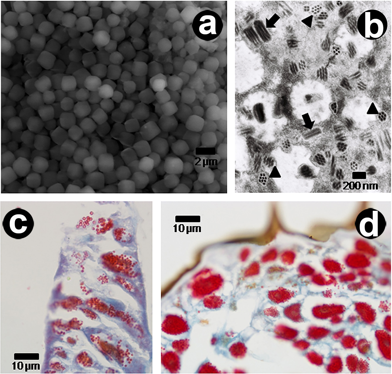 a. Purified AcMNPV cubic OBs under the scanning electron microscope. b. Ultrathin section of a nucleus of an AcMNPV-infected Helicoverpa gelotopoeon larva. Virions containing multiple nucleocapsids per envelope in longitudinal (arrows) and transversal (arrowheads) view. c. Epidermis of an AcMNPV-infected H. gelotopoeon larva after Azan staining, showing bright-red OBs. d. Same as before, but in a HegeSNPV-infected larva.