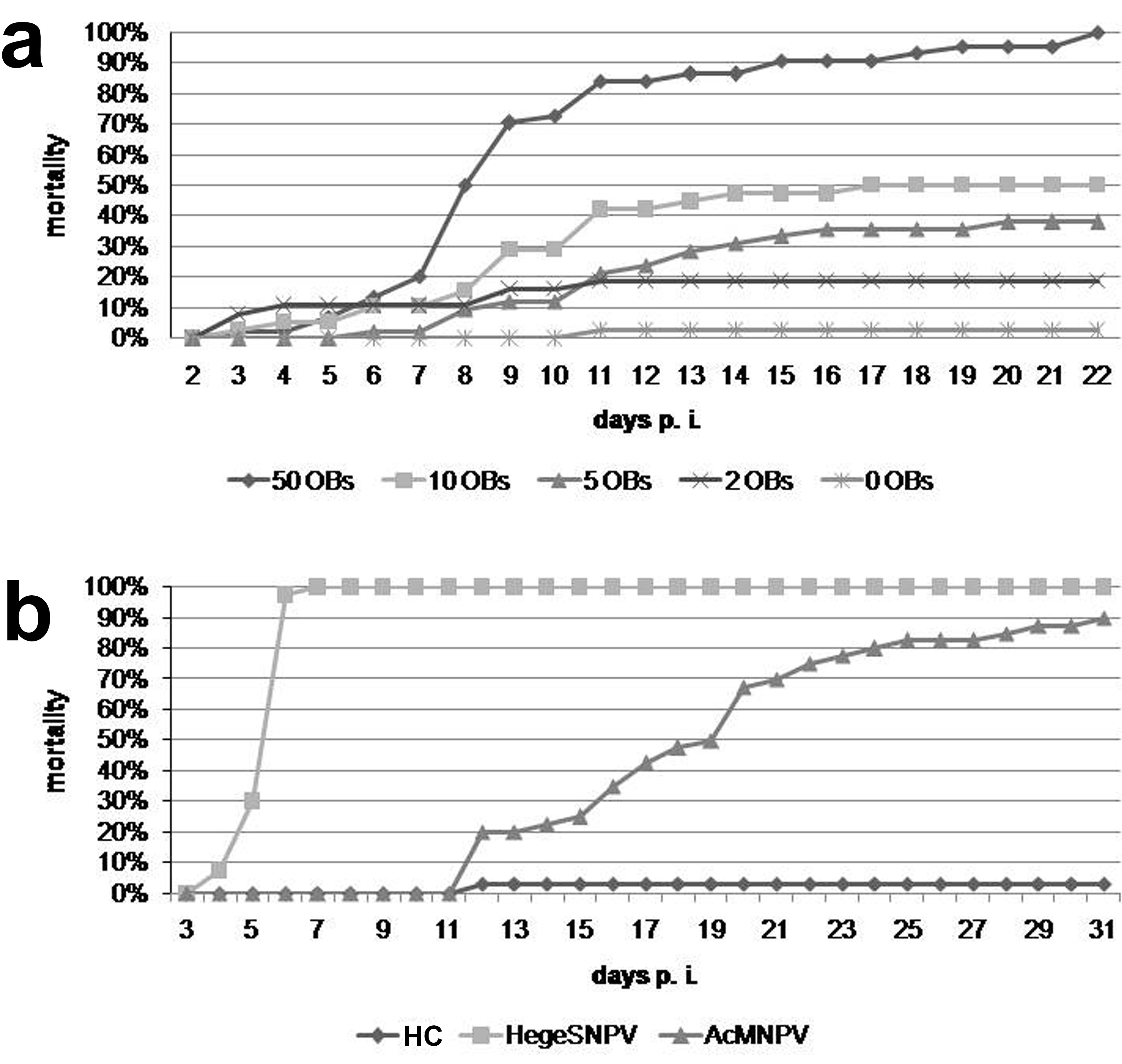 a. Neonate larvae inoculated with different doses of AcMNPV through the droplet-feeding method. b. Third-instar larvae exposed to 400 OBs/mm2 of HegeSNPV or AcMNPV by diet surface contamination. HC: healthy (uninfected) controls.