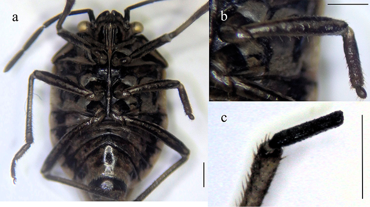 a-b. Case 1. a. general view. b. detail of malformed leg. c. Case 2, malformed tarsus. Scale bar= 1mm.