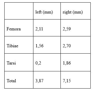 The specimen shows an oligomeric right metathoracic leg tarsus, with only one segment (0.72 mm). The tarsomere is subcylindrical with irregular apex and there are no signs of anarthrogenesis. The left metathoracic leg tarsus is normal (2.08 mm) with the first tarsomere slightly longer than the malformed (0.76 mm).