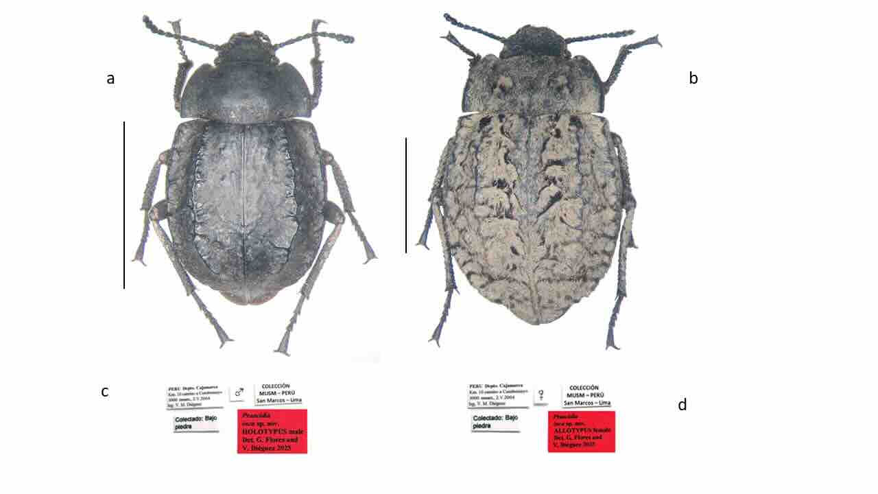 Type material. Holotype male (label Fig. 1c): PERU: Cajamarca, Cajamarca, km 10 camino a Cumbemayo, 3000 m, 02-V-2004, V. M. Diéguez (MUSM). Allotype female (label Fig. 1d) (MUSM) and 13 paratypes same data as holotype (2 MUSM male and female, 6 IADIZA 3 males, 3 females, 4 VMDC 2 males, 2 females, 1 JEBC male), km 17 camino a Cumbemayo, 3300 m, 02-V-2004, V. M. Diéguez, (1 female MGGC), km 17 camino a Cumbemayo, 3400 m, under stones, 6-8-VI-2003, V. M. Diéguez, (2 females MNNC), km 26 camino a Chetilla, 3400 m, 02-V-2004, V. M. Diéguez (1 female VMDC), Cajamarca, Baños del Inca, 07°00'20.41"S 78°28'03.97"W, 3737 m, 03-IV-2023, L. Inga, (2 males MUSM), La Encañana, 5,3 km NE to Garita Pongo, 06°56´20.06”S 78°26´0535”W, 4050 m, III-2010, A. Giraldo, (1 female MEKRB), VI-2010, A. Giraldo, (1 female IADIZA), Michiquillay, 3,2 km S to Quiquimayoc, 07°00´58.68”S 78°23´56.13”W, 3640 m, III-2012, A. Giraldo, 3 IADIZA (1 male, 2 female), 3800 m, V-2012, A. Giraldo, (1 female MEKRB), 24 patarypes: La Encañana, 3798 m, 06°59´06”S 78°27´39”W, VI-2015, O. Queirolo, 6 IADIZA (5 males, 1 female), 2 MACN (males), 2 FMNH (1 male, 1 female), 2 NHMB (1 male, 1 female), 6 MEKRB (4 males, 2 females, 6 MUSM (3 males, 3 females, Quebrada Honda, Maqui Maqui, 06°56´50.00”S 78°29´05.00”W, 4066 m, 19-20-XI-2010, F. Chavez (1 female MUSM). La Libertad, Sánchez Carrión, Huamachuco, C.C. Santo Domingo, 07°55´39.43”S 78°08´55.31”W, 3647 m, 30-IV-2015, E. Gamboa, 1 male (MUSM).
