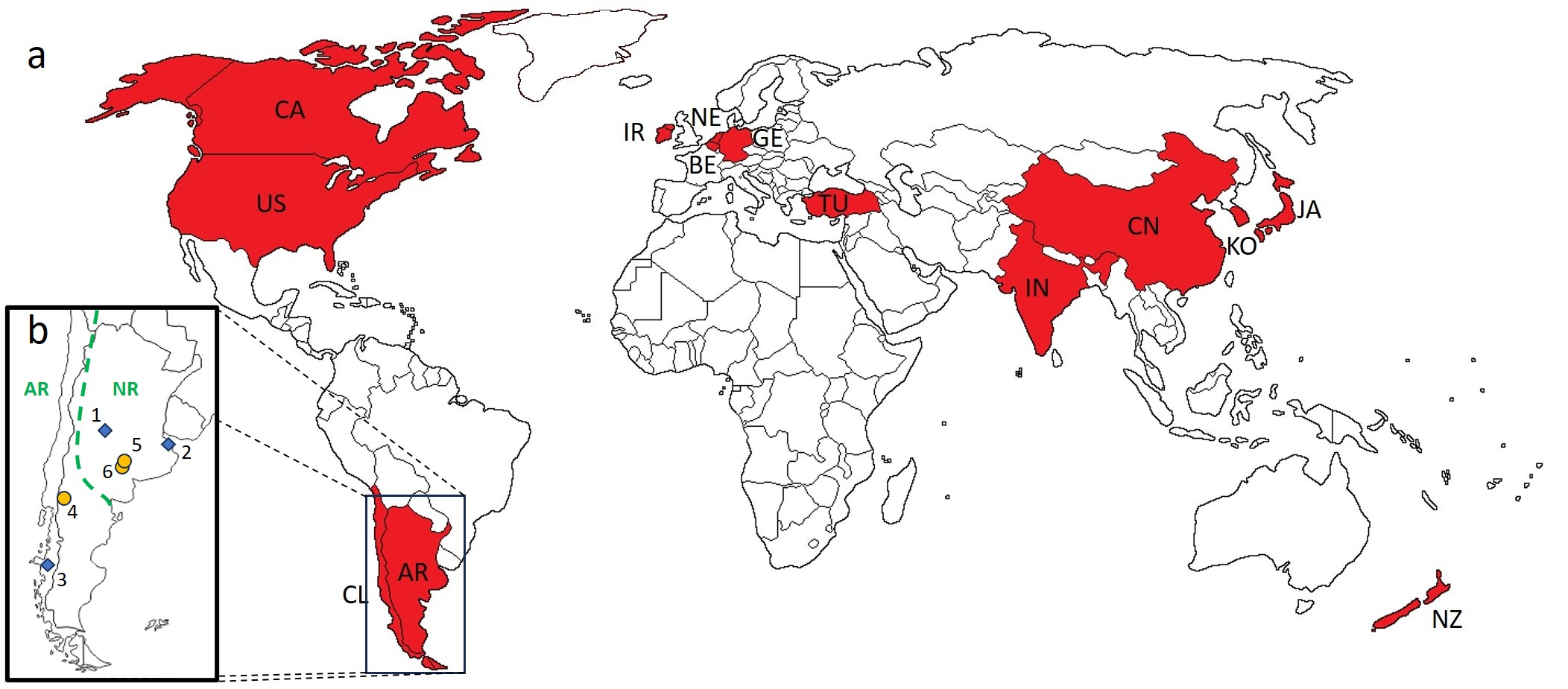 a. Countries in which it has been registered. b. Records of L. buchneri in South America. References= AR: Argentina, BE: Belgium, CA: Canada, CL: Chile, CN: China, GE: Germany, IN: India, IR: Ireland, JA: Japan, KO: Korea, NE: Netherlands, NZ: New Zealand, TU: Türkiye, US: United States of America. Previous records: 1: La Carolina (San Luis), 2: Colonia Urquiza (Buenos Aires) (Plischuk et al., 2013), 3: “Southern Chile” (Arismendi et al., 2016), indicated with diamonds, new records: 4: San Carlos de Bariloche (Río Negro), 5: Macachín, 6: Guatraché (La Pampa), indicated with circles. The dashed green line represents the approximate boundary between the Andean Region (AR) and the Neotropical Region (NR).