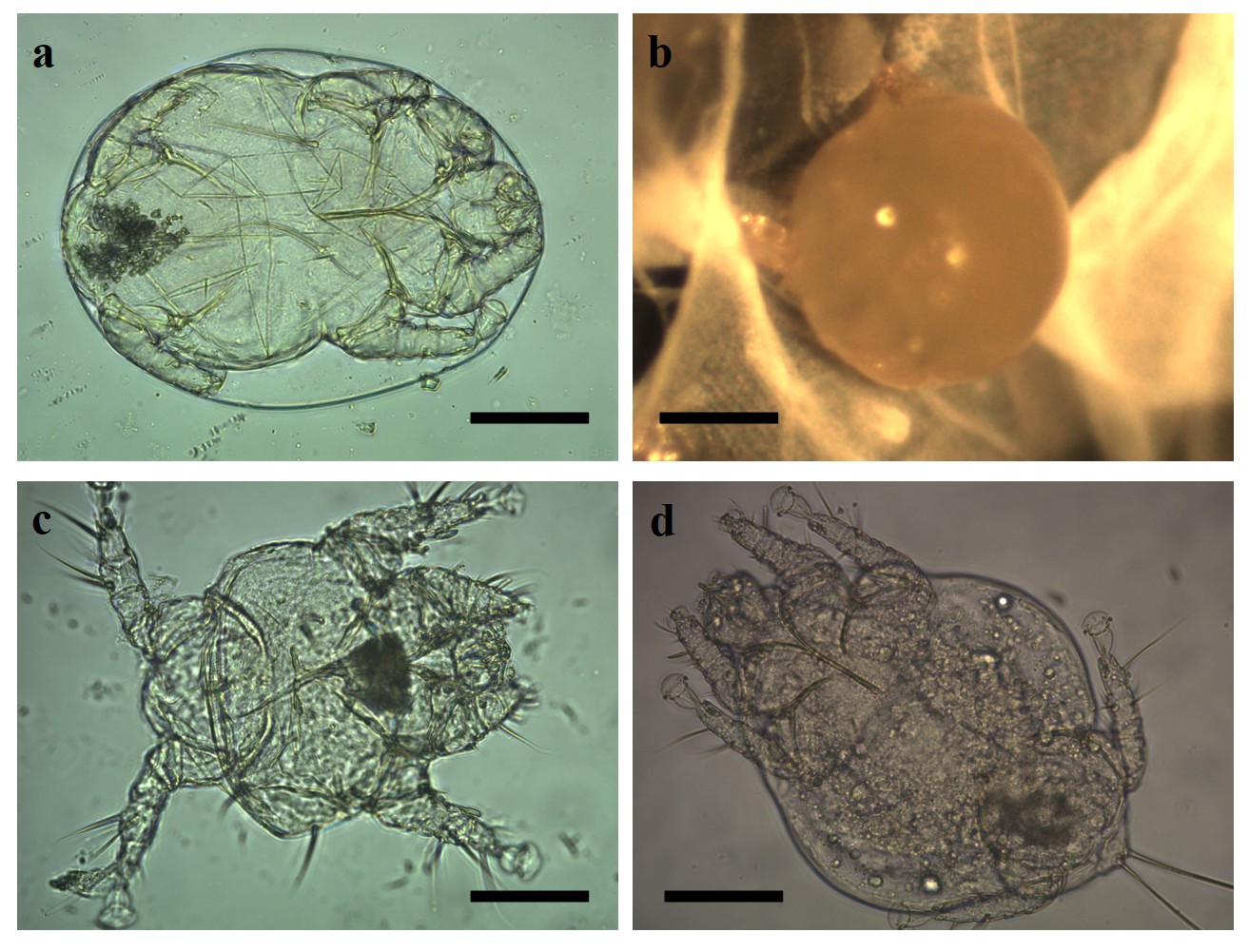 a. Larvated egg. b. Gravid female. c. Male. d. Larviform female. Scale bars= a, c: 30 µm, b: 200 µm, d: 35 µm