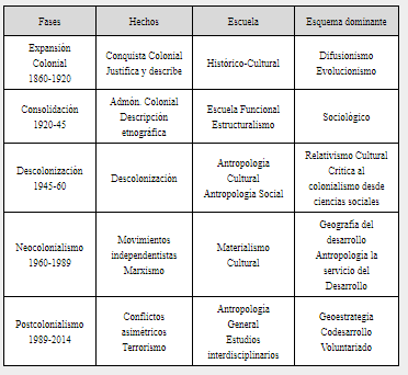 Fuente: De Carlos 2015:5Esta última fase también es referida por Fermín del Pino (Del Pino 1991: 15), haciendo alusión a Leclerc que es quien en primer lugar la enuncia. Nosotros añadimos otras dos fases: una Fase Neocolonial y una Fase Postcolonial. Este es un esquema útil, porque permite entender cuál ha sido el uso interesado, que se ha hecho de la antropología desde el siglo XIX hasta nuestros días. En la Figura 1 se detallan: los hechos históricos más relevantes, la escuela antropológica dominante y el enfoque general. Por ejemplo, se puede ver, en la fase neocolonial, cuando se han retirado los administradores coloniales, los antropólogos frecuentemente son tomados como un elemento vinculado a la represión de la metrópoli. Es decir se entiende la antropología como una herramienta de control. A pesar de ello, los antropólogos frecuentemente defendieron y tomaron parte en favor de las comunidades que investigaban.