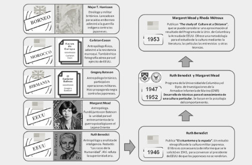 Ruth Benedict antropóloga, discípula de Boas y amiga de M. Mead, también se implicó en la situación política del momento. Trabajó en inteligencia y llegó a ser en 1943 el analista principal de una de las secciones de la Oficina de Información de Guerra (OWI). Publicó junto con otros autores un folleto para la concienciación de la igualdad de las razas y en contra del nazismo. Benedict, junto con otros antropólogos de la OWI, realizaron un estudio respecto a la visión del Emperador por parte de la sociedad japonesa. Este estudio fue utilizado para convencer al presidente de los EEUU, F. D. Roosevelt de que el emperador japonés no aceptaría las condiciones de rendición. Más tarde, en 1946 Benedict publicó: El crisantemo y la espada, un estudio etnográfico de la cultura militar japonesa. Ella nunca visitó Japón; esta perspectiva de investigación se llama desde entonces: “Estudio de la Cultura a Distancia”.