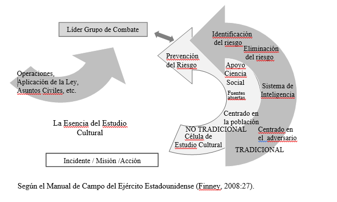 La esencia del Enfoque Cultural (Figura 4) es el apoyo de las operaciones militares mediante el conocimiento socio cultural del área de operaciones. No sustituye al sistema de inteligencia, ni tan siquiera se integra en él. Podemos considerar que el Enfoque Cultural y el sistema de inteligencia proporcionan al Mando información de diferente carácter y con finalidad distinta. El sistema de inteligencia está enfocado hacia la identificación del riesgo, mientras que las ciencias sociales previenen de los riesgos. De manera resumida, se puede considerar que el Líder del Grupo de Combate en el Ejército de los Estados Unidos desde el año 2008, recibe apoyo mediante tres vectores diferentes: Inteligencia, Operaciones Psicológicas y Equipo Cultural.