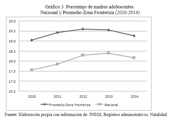 Gráfica 3.- Porcentaje de madres adolescentes: Nacional y Promedio Zona Fronteriza (2010-2014)