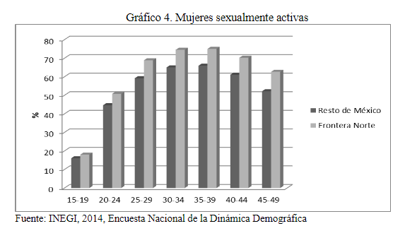 Por lo apreciado en la información analizada, la edad al comienzo de las relaciones sexuales entre las mujeres más jóvenes se encuentra entre los 15 y 16 años -en las sexualmente activas- lo que pudiera sugerir que este indicador está descendiendo entre las adolescentes, lo que no parece incidir en un cambio a un nivel más bajo de la edad a la primera unión conyugal o matrimonio formal, pero posiblemente sí en que se eleve la tasa especifica de fecundidad por edad de las adolescentes por una mayor exposición a un embarazo. También llama la atención al respecto la mayor proporción de mujeres que son sexualmente activas en la generalidad de las edades reproductivas en la frontera norte del país (Ver Gráfica 4), lo que expone en un mayor grado a la aparición de embarazos no planificados, particularmente en las primeras relaciones sexuales donde la protección contraceptiva es más limitada (González, H. 2013).