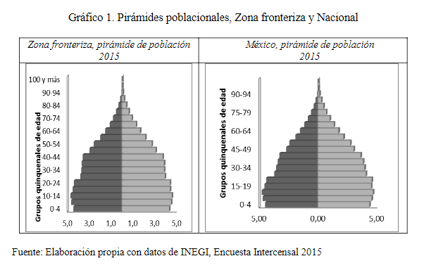 Gráfica 1.- Pirámides poblacionales, Zona fronteriza y Nacional