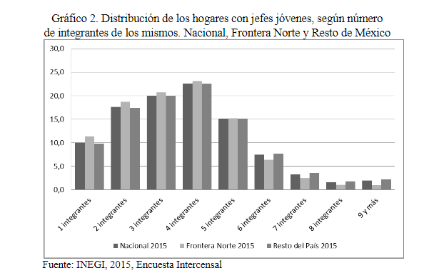 Fuente: Elaboración propia con datos de INEGI, Encuesta Intercensal 2015.Tamaño y estructura de los hogares con jóvenes en la frontera norte de México