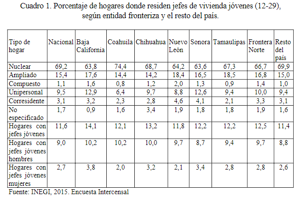 Como preámbulo de la temática referida se afirma que una forma de analizar los arreglos familiares que se pueden estar presentando en la zona de estudio, es a través de las características de los hogares de los jóvenes en esta frontera del país. Al respecto se puede comenzar planteando que en México existen 31.9 millones de hogares y en 14.9 de ellos reside algún joven, lo que representa 66.0 por ciento del total de unidades domésticas. Esta proporción en la frontera norte es ligeramente superior (66.8 %).
