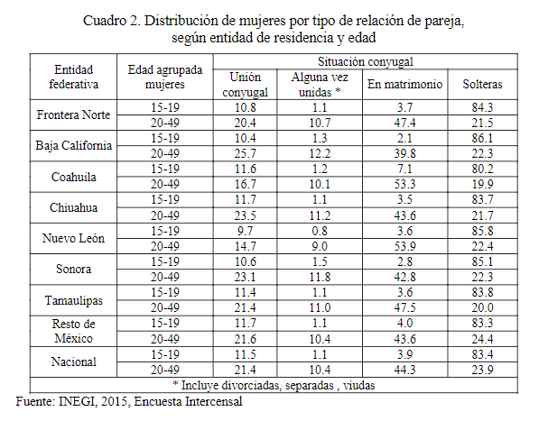 Fuente: INEGI, 2015, Encuesta Intercensal.En cuanto al tipo de unión conyugal se aprecia que el matrimonio formal manifiesta el papel hegemónico en la conformación de las familias existentes tanto en la frontera norte como en el resto del país, sobrepasando con mucho a las uniones libres, sin embargo en el caso de una entidad del norte como es Baja California dicha supremacía se hace significativamente menor, ganando en importancia –con relación a las otras entidades fronterizas- las uniones libres (Ver Cuadro 2). De igual forma se hace evidente como predominan las uniones con relación a los matrimonios entre las mujeres más jóvenes, para las que los estados conyugales no solteros pueden originarse en períodos con cohabitaciones menos estable, formales, como forma de estabilización de dichas relaciones o de legitimación de embarazos no planificados.