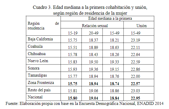 Cuadro 3.- Edad mediana a la primera cohabitación y unión, según región de residencia de la mujer