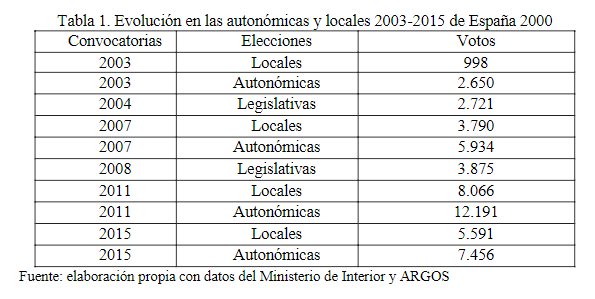 Tanto en las elecciones generales como en las europeas, E2000 no ha obtenido representación, particularidad que comparte con otra formación de derecha radical populista española en el siglo XXI, PxC. No obstante, el partido no presentó candidatura ni en las elecciones europeas de 2014 ni en las generales de diciembre de 2015. Para explicar esta última ausencia ante su militancia, E2000 publicó un documento titulado “Ante las Elecciones Generales del 20 de Diciembre de 2015” (España 2000, 2015). En él, ataca a los valores jurídicos de la Constitución porque consideran que no se respeta el derecho a la igualdad y el pluralismo político y animan a construir la alternativa que defienda la soberanía, identidad e independencia de los españoles. Sobre los nuevos partidos, manifiestan que “pretenden regenerar todo desde un mero reformismo con receta ultra liberal o bien con el reciclaje de las recetas marxistas” (España 2000, 2015).