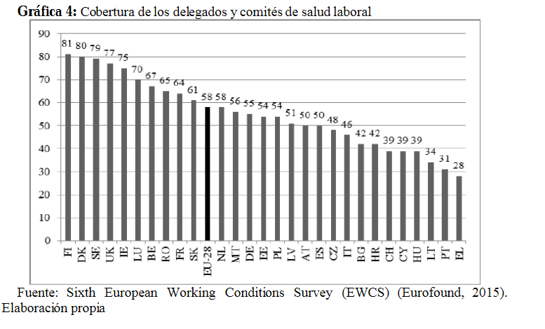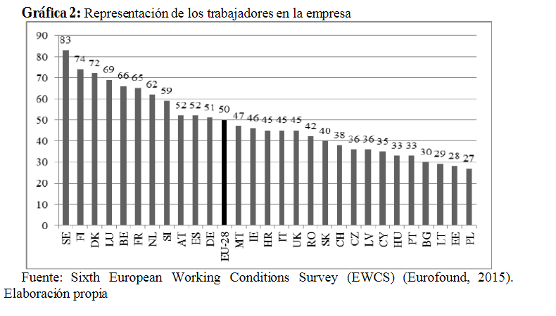 La última Encuesta Europea sobre las Condiciones de Trabajo (EWCS) (European Foundation for the Improvement of Living and Working Conditions, 2015) informa que prácticamente la mitad de los trabajadores de la UE-28 disponen en su empresa de representación sindical (SSE-Comité), si bien dicha tasa media varía considerablemente (gráfica 2), alcanzando niveles de cobertura próximos al 80% en los países escandinavos y de apenas un tercio en los del área oriental, situándose los países latinos y centroeuropeos en torno a la media.