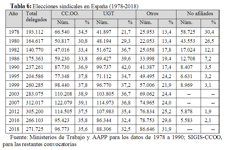 Tabla 6: Elecciones sindicales en España (1978-2018)