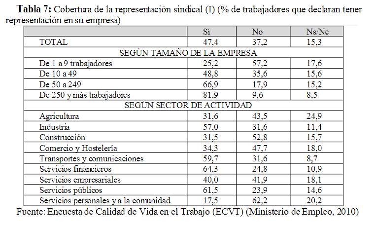 En el primer caso, la Encuesta de Calidad de Vida en el Trabajo (ECVT) (Ministerio de Trabajo, 2010) (tabla 7), realizada por el Ministerio de Trabajo desde 1999 e interrumpida en 2010, sitúa la cobertura directa del sistema de representación sindical en el 47,4% sobre el total de la población asalariada (alrededor de 6’5 millones de trabajadores). Se trata, con todo, de valores mínimos (en el 15,3% de los casos no consta una respuesta clara al respecto) y desigualmente repartidos según tamaño de empresa y sector de actividad.