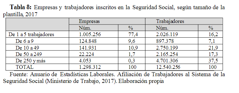 Tabla 8: Empresas y trabajadores inscritos en la Seguridad Social, según tamaño de la plantilla, 2017