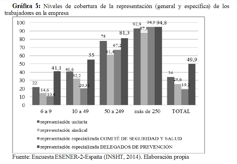 Según la Encuesta Nacional de Gestión de Riesgos Laborales en las Empresas Española (INSHT, 2014) (gráfica 5), la red de delegados de prevención alcanza una cobertura media del 49,9% de los centros de trabajo con más de 5 trabajadores, variando sustancialmente según el tamaño de la plantilla (del 41,1% en las empresas de entre 6 y 9 trabajadores y el 94,8% en las de más de 250) y el sector de actividad (del 46,2% en comercio y hostelería al 60,2% en la industria manufacturera).