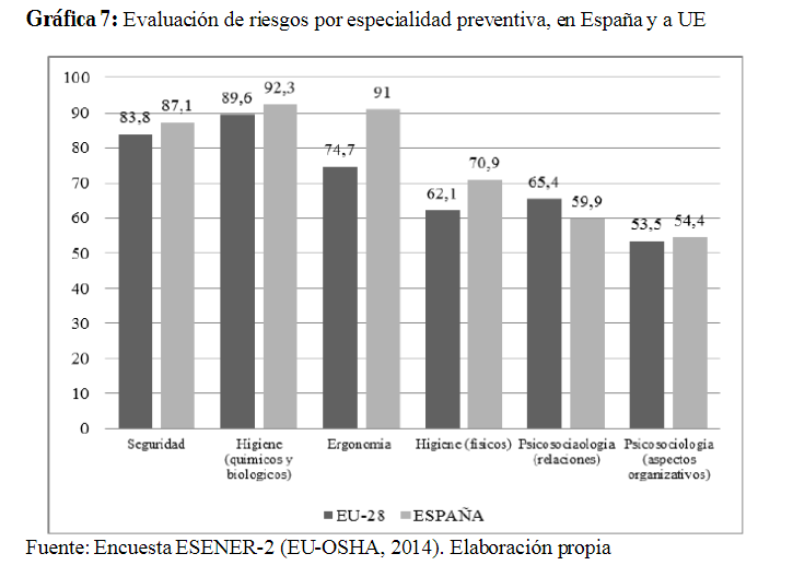 Gráfica 7: Evaluación de riesgos por especialidad preventiva, en España y a UE