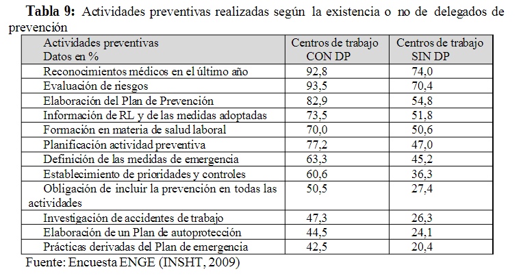 Por su parte, la Encuesta Nacional de Gestión de la Seguridad y Salud en las Empresas (ENGE) (INSHT, 2009) acredita que las actividades preventivas (tabla 9) son mucho más frecuentes en los centros de trabajo que cuentan don delegados de personal (DP) que en los que carecen de dicha representación.