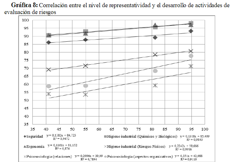 Fuente: Encuesta ENGE (INSHT, 2009)En este punto, nuestra investigación (gráfica 8) constata la existencia de una fuerte correlación positiva entre la existencia de representantes y la realización de actividades preventivas (r2=0,94; p<0,07 seguridad; r2=0,99; p<0,04 y r2= 0,99; p<0,2 higiene industrial; r2=0,97; p<0,04 ergonomía; r2= 0,88; p<0,01 y r= 0.95; p<0,02 psicosociología, relaciones y condiciones, respectivamente).