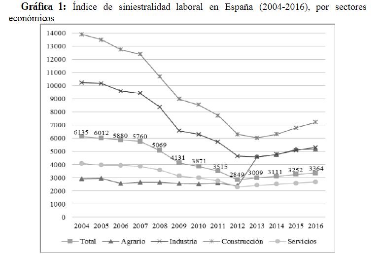 Gráfica 1: Índice de siniestralidad laboral en España (2004-2016), por sectores económicos