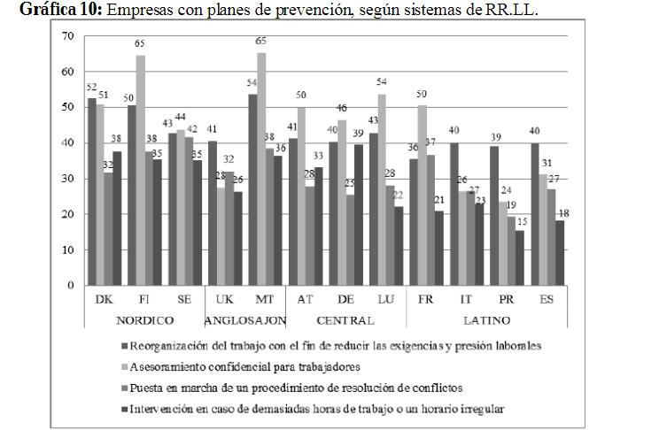 En términos comparativos (gráfica 10), los sistemas de relaciones laborales nórdico y centroeuropeo presentan niveles de implementación de las medidas preventivas superiores a los del área latina como resultado, fundamentalmente, de la más amplia cobertura de sus modelos de representación de los trabajadores, tanto genérico como específico, como hemos tenido ocasión de comprobar supra (vid, gráficas 2 y 6).