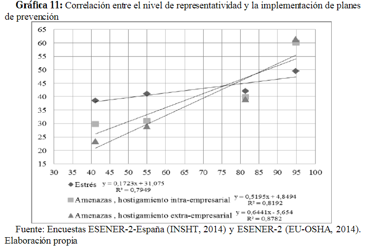En referencia, a la última fase del proceso preventivo (gráfica 11), el impacto de la representación de los trabajadores presente también una fuerte correlación positiva con el establecimiento de planes, programas y procedimientos (r=0,8916; p<0,04. para programas frente al estrés; r=0,9051; p<0,01 y r=0,937; p<0,005 para planes y procedimientos de acción frente amenazas o hostigamiento intra y extra empresarial respectivamente).