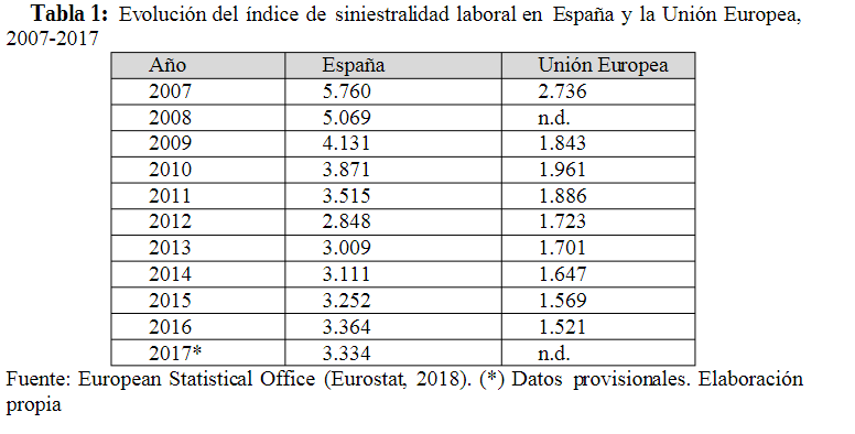 Tabla 1: Evolución del índice de siniestralidad laboral en España y la Unión Europea, 2007-2017