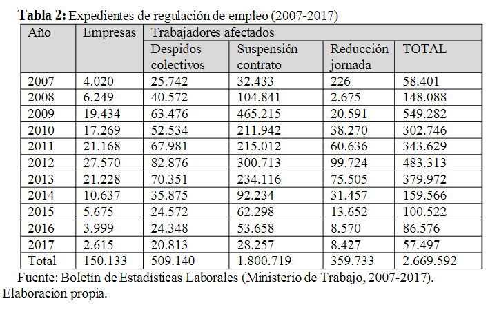 Tabla 2: Expedientes de regulación de empleo (2007-2017)