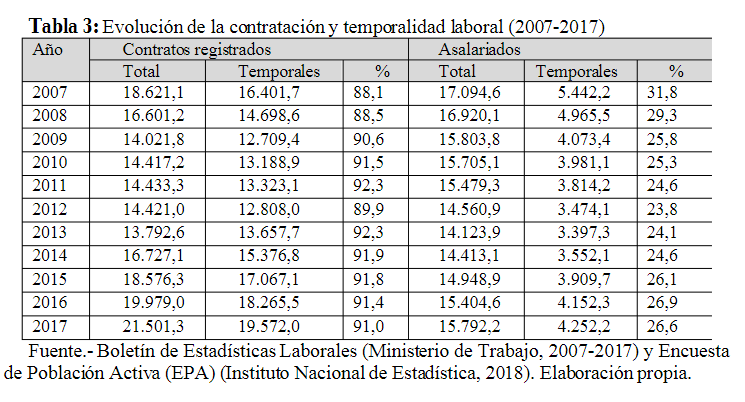Tabla 3: Evolución de la contratación y temporalidad laboral (2007-2017)