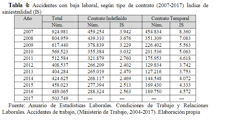 Tabla 4: Accidentes con baja laboral, según tipo de contrato (2007-2017) Índice de siniestralidad (IS)